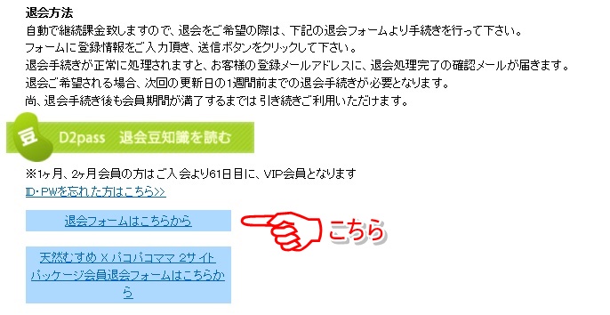 退会フォームへ入りメールアドレスとユーザーID、パスワードを入力するだけで簡単に天然むすめを退会できます。会員期限の前日までにこの作業を済ませていれば大丈夫です。詳しくはこちらへ。 |